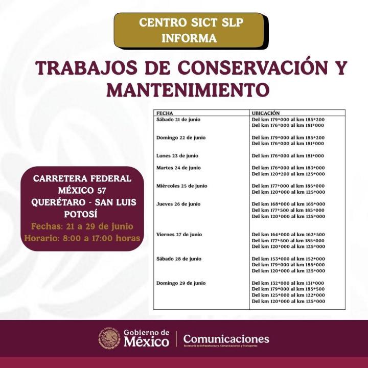 El Centro SICT San Luis Potosí informa que habrá trabajos de conservación en la carretera federal México 57, tramo Querétaro-San Luis Potosí, bajo el esquema Asociación Público-Privada (APP).