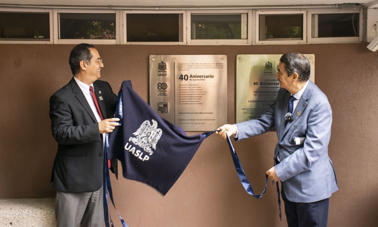 Este 21 de junio se llevó a cabo la ceremonia de develación de placas y entrega de reconocimientos a los exalumnos de las generaciones 1980-1985 y 1981-1985 de la carrera de Ingeniería Civil de la Universidad Autónoma de San Luis Potosí (UASLP), con motivo del 40 aniversario de su egreso. El evento, realizado en la Facultad de Ingeniería, reunió a autoridades universitarias, docentes, familiares y amigos de los homenajeados.