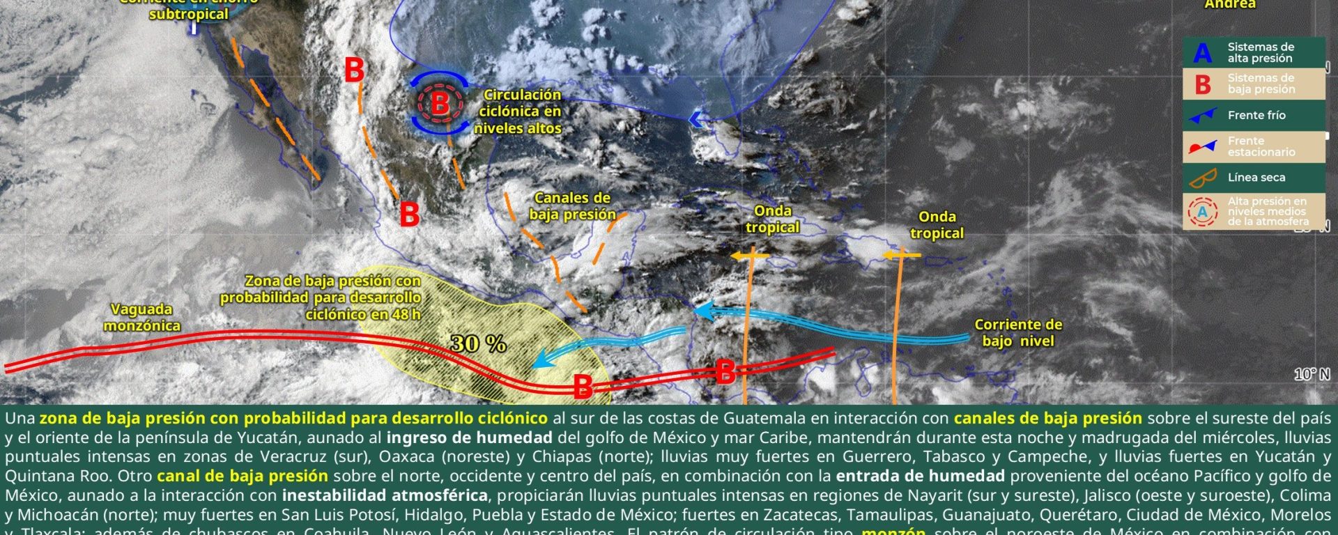 Viento de 20 a 30 km/h con rachas de 40 a 60 km/h: Chihuahua, Durango, Coahuila, Nuevo León, Tamaulipas, San Luis Potosí, Zacatecas, Aguascalientes, Guanajuato, Querétaro, Hidalgo, Tabasco, Campeche, Yucatán y Quintana Roo; con posibles tolvaneras: Baja California y Baja California Sur.