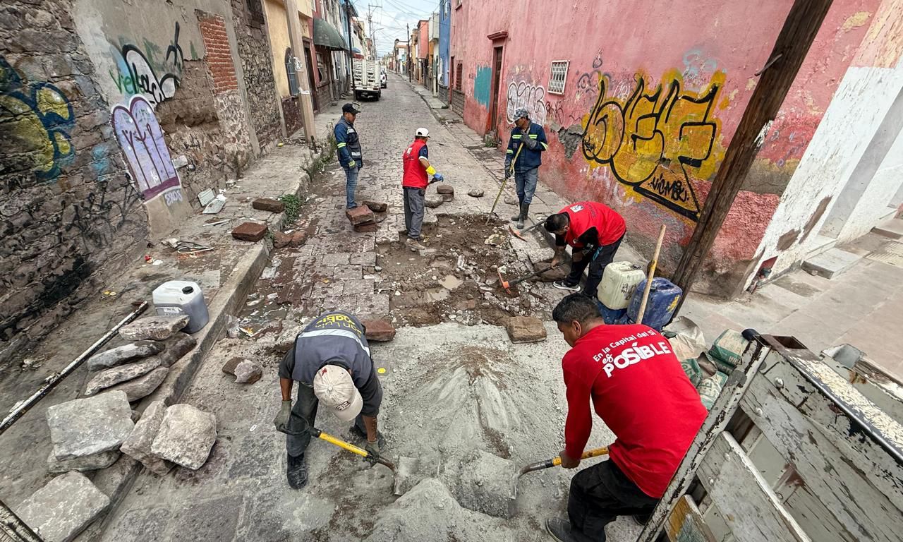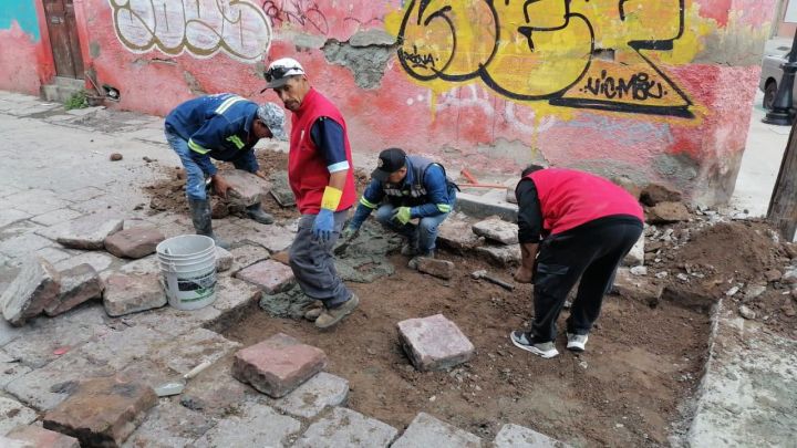 El Ayuntamiento de San Luis Potosí continúa con los trabajos de bacheo y reparación de banquetas en el Centro Histórico, fortaleciendo la seguridad y la movilidad vial.