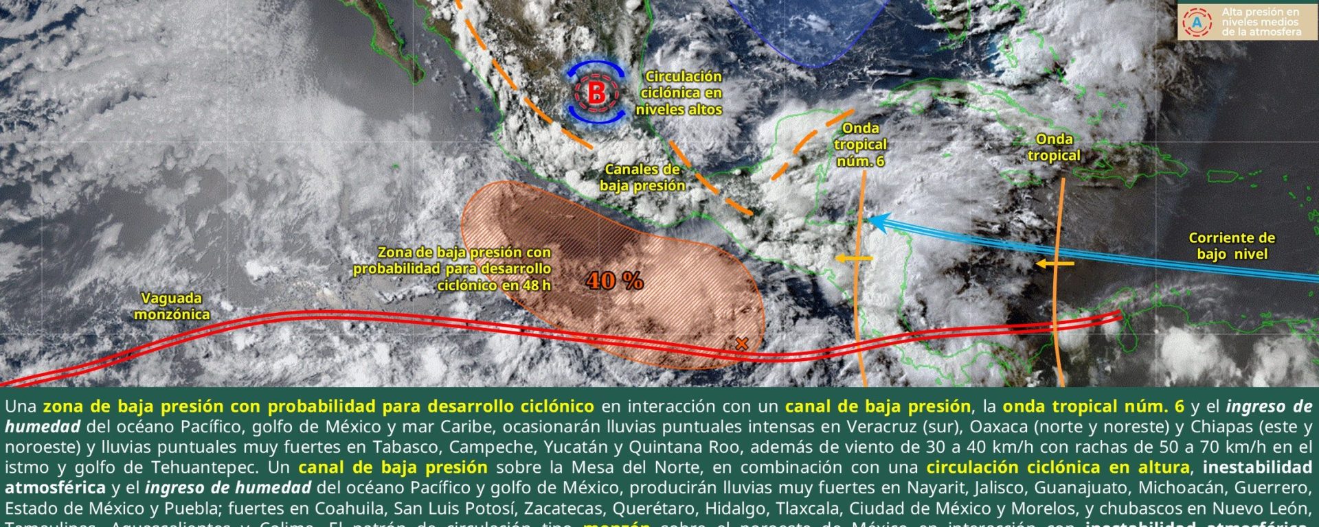 Lluvias fuertes con puntuales muy fuertes (50 a 75 mm): Sonora, Durango, Sinaloa, Nayarit, Jalisco, Campeche, Yucatán y Quintana Roo.