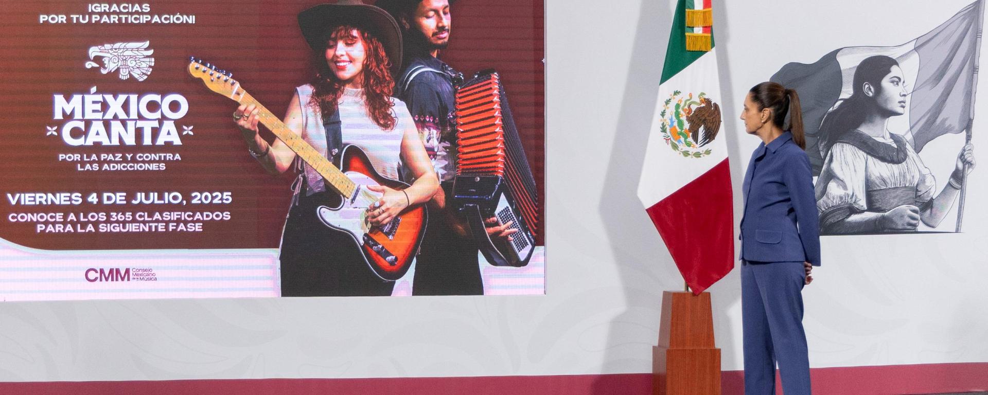 Además, en la conferencia matutina, la Secretaría de Cultura presentó a parte del jurado del concurso binacional México Canta por la paz y contra las adicciones, que está conformado por personalidades como la cantante, Regina Orozco; la cantautora, Mónica Vélez, el presidente del Consejo Mexicano de la Música (CNM), Miguel Trujillo; el productor, Francisco Javier Ramírez, así como por hombres y mujeres miembros del del CNM y de la Sociedad Autores y Compositores, que realizaron una revisión virtual en la que calificaron a los más de 15 mil participantes, con lo cual el próximo 4 de julio se anunciarán a los primeros 365 participantes clasificados.