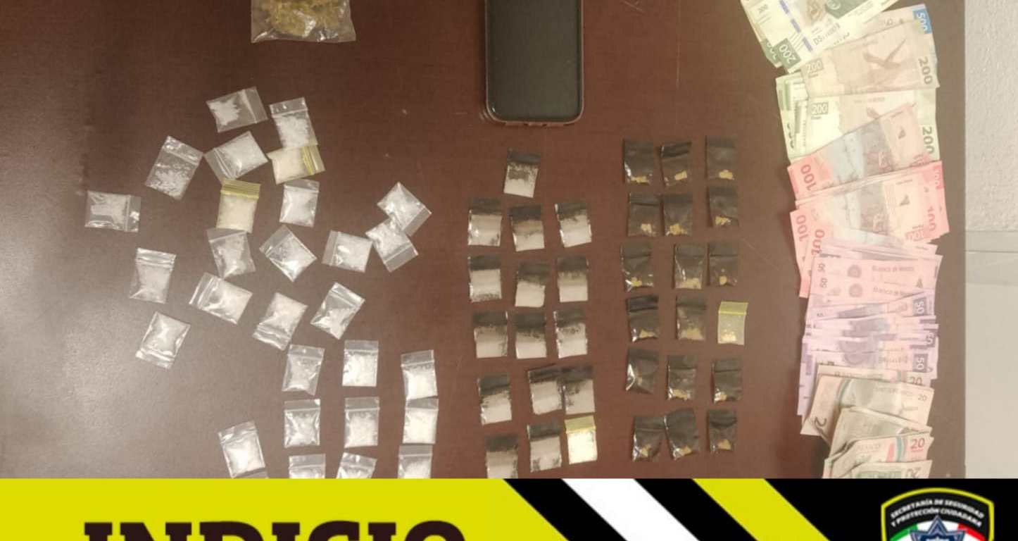 Los agentes municipales localizaron al interior de la mochila, 29 envoltorios de plástico que contenían una sustancia granulada similar al cristal, 16 envoltorios con un polvo blanco con las características físicas de la cocaína, 18 envoltorios que contenían droga conocida como piedra, así como una bolsa con hierba seca verde similar a la marihuana.