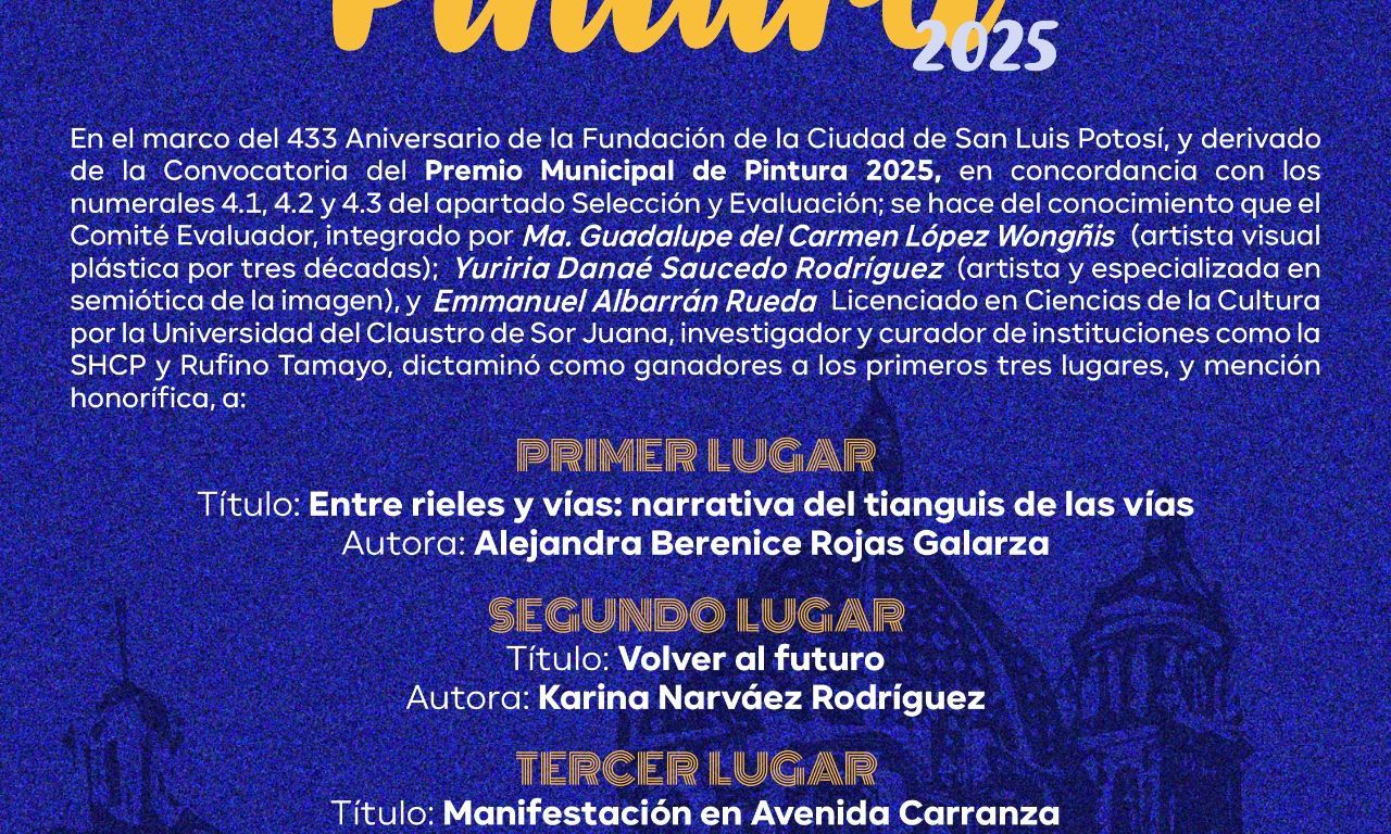 La ceremonia de entrega de premios y reconocimientos, junto con la inauguración de la Muestra Colectiva del Premio Municipal de Pintura 2025, se llevará a cabo en el mes de agosto en el patio del Centro Cultural Palacio Municipal de San Luis Potosí, en el marco de la celebración de San Luis Rey de Francia.
