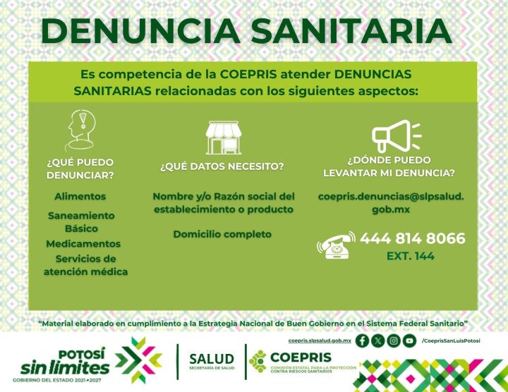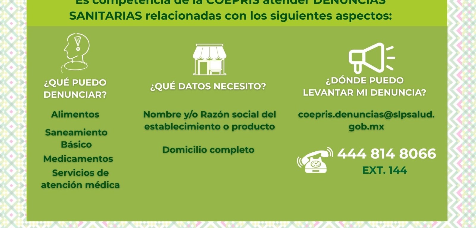 La Comisión Estatal para la Protección Contra Riesgos Sanitarios (COEPRIS) de los Servicios de Salud, tiene como misión proteger la salud de la población de posibles riesgos sanitarios a través de diversas estrategias y una de las cuales se ha fortalecido por instrucciones del Gobierno del Estado, es la atención de Denuncias Sanitarias de algún producto o servicio que, por alguna omisión o mala práctica, ponga en riesgo la salud de las y los potosinos.