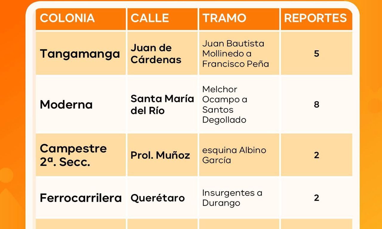 Con el fin de que la población tome las medidas pertinentes y considere los cierres parciales a la circulación, la Dirección de Obras Públicas informó que se trabajará en el Fraccionamiento Tangamanga, en la calle Juan de Cárdenas, entre Mollinedo y Francisco Peña; en la Colonia Moderna, calle Santa María del Río, de Melchor Ocampo a Santos Degollado.