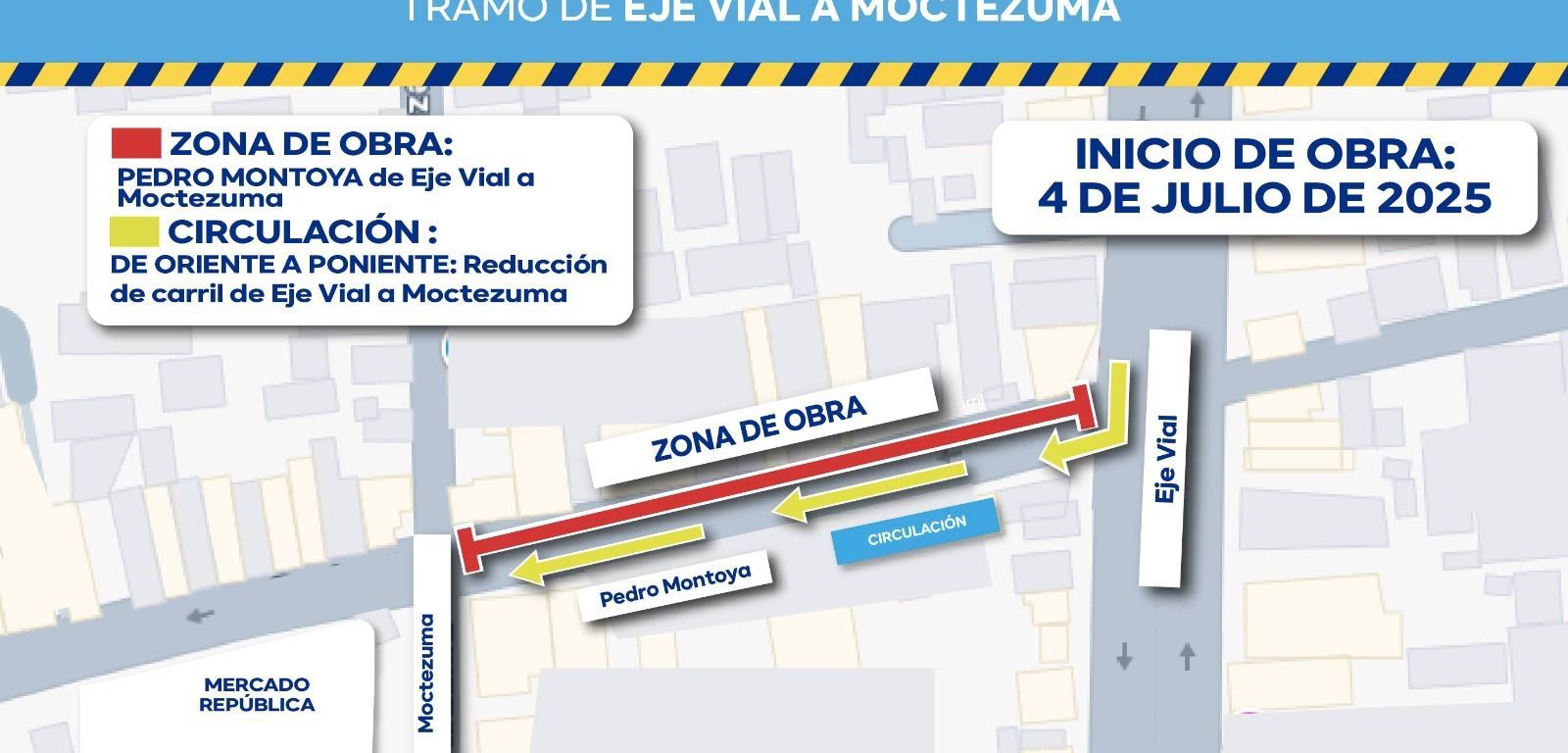 La Dirección General de Policía Vial y Movilidad de la Secretaría de Seguridad y Protección Ciudadana implementará un dispositivo vial este viernes 04 de julio en la intersección de las avenidas Eje Vial y Pedro Montoya con motivo de trabajos de reparación de drenaje que realizará el Interapas.