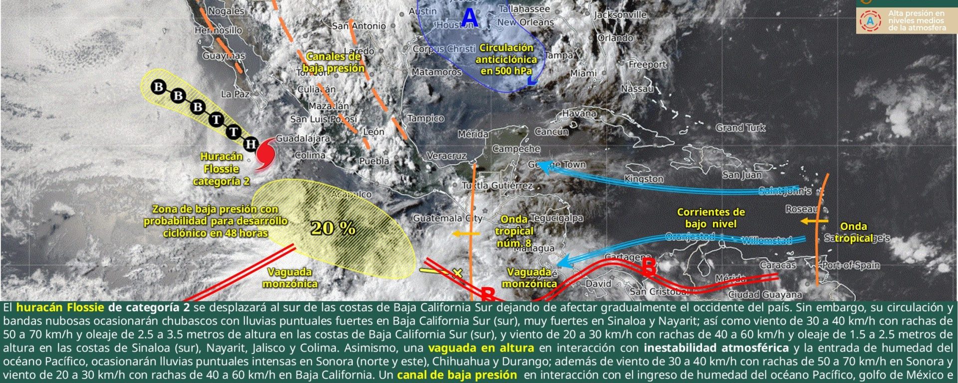Intervalos de chubascos (5 a 25 mm): Baja California Sur, Colima, Nuevo León, Tamaulipas, San Luis Potosí, Querétaro, Hidalgo, Tlaxcala, Estado de México, Ciudad de México, Morelos, Puebla, Veracruz, Tabasco, Campeche, Yucatán y Quintana Roo.
