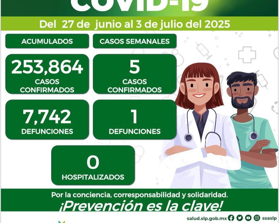 Los municipios en donde se registrarón los nuevos casos son: la Capital (3), Ciudad Valles (1), y Tanquián (1). Esta semana se reportó una muerte por Covid, corresponde a una niña de 2 años de edad de Ciudad Valles, por lo que la cifra de defunciones aumento a 7 mil 742 en el Estado.