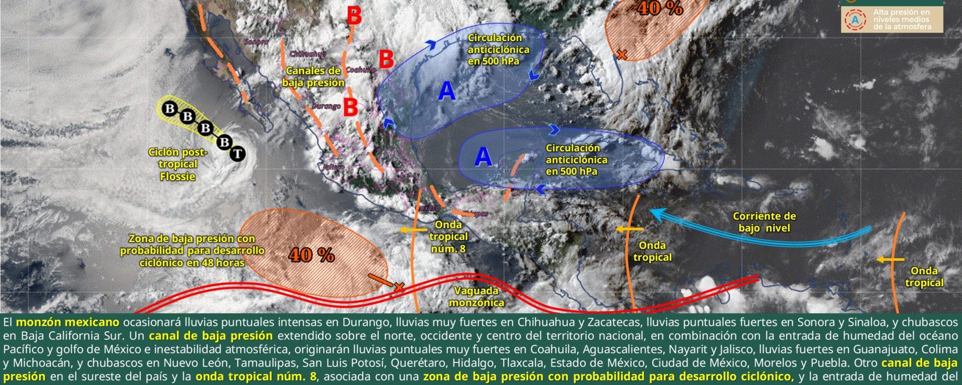 Chubascos con lluvias puntuales fuertes (25 a 50 mm): Sonora, Chihuahua, Nuevo León, Zacatecas, Jalisco, Colima, Michoacán, Guerrero, Oaxaca y Chiapas.