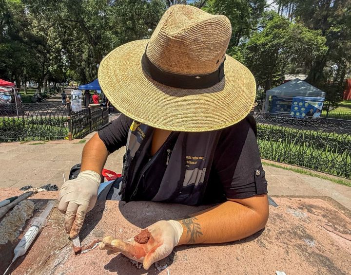 La intervención contempla procesos de consolidación del soporte pétreo, eliminación de cemento y ribetes, así como la colocación de junteo, acciones que también buscan proteger la inscripción conmemorativa que forma parte de esta zona perimetral.