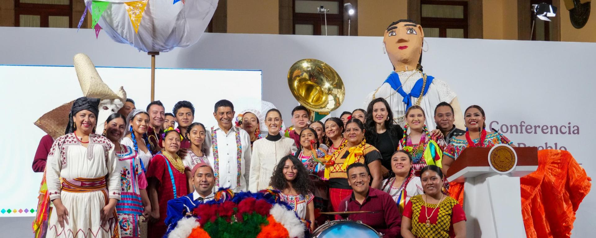 Ciudad de México, 11 de julio de 2025.- La fiesta y el color de la Guelaguetza 2025, visitaron la conferencia matutina: “La mañanera del pueblo” de la Presidenta Claudia Sheinbaum Pardo, para invitar a las mexicanas y los mexicanos a ser parte de esta celebración, que se realizará en Oaxaca a partir del 21 de julio, y que representa un compromiso colectivo que teje redes entre los pueblos de dicha entidad.