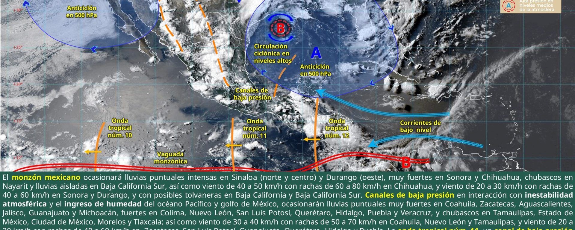 Cielo medio nublado a nublado durante el día, con lluvias puntuales intensas en Chihuahua (oeste y suroeste) y Durango (oeste, noroeste y norte), muy fuertes en Coahuila, fuertes en San Luis Potosí, Zacatecas y Aguascalientes; las lluvias antes mencionadas estarán acompañadas con descargas eléctricas, fuertes rachas de viento, posible caída de granizo; así como originar encharcamientos, deslaves e inundaciones, y el incremento en los niveles de ríos y arroyos. Chubascos con descargas eléctricas y posible caída de granizo en Nuevo León. Por la mañana, ambiente templado a cálido en la región y fresco a frío en sierras. Durante la tarde, ambiente cálido a caluroso. Viento de componente este de 30 a 40 km/h con rachas de 50 a 70 km/h en Coahuila y Nuevo León, viento de 20 a 30 km/h con rachas de 40 a 60 km/h en Chihuahua, Durango, Zacatecas y San Luis Potosí, y viento de 20 a 30 km/h con rachas de hasta 40 km/h en zonas de tormenta.
