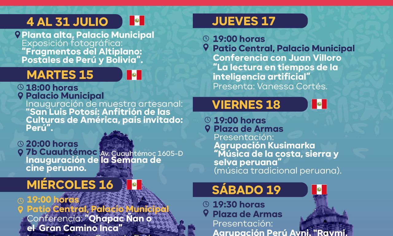 San Luis Potosí Capital Americana de la Cultura 2025 recibe esta semana al hermano país de Perú, quienes ofrecerán una probada de su muestra gastronómica y artesanal, además de un interesante intercambio artístico en Plaza de Armas y dentro del Centro Cultural Palacio Municipal.