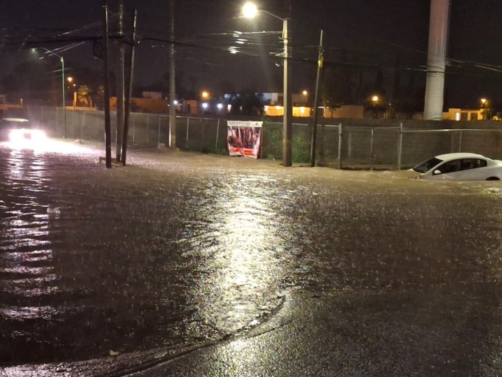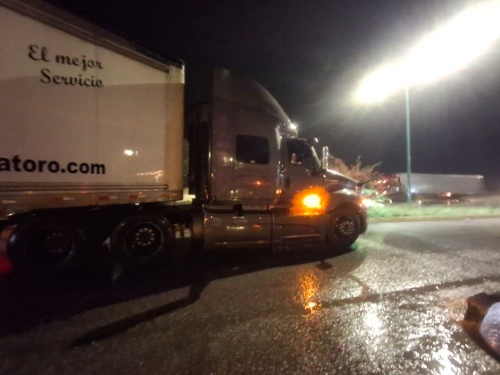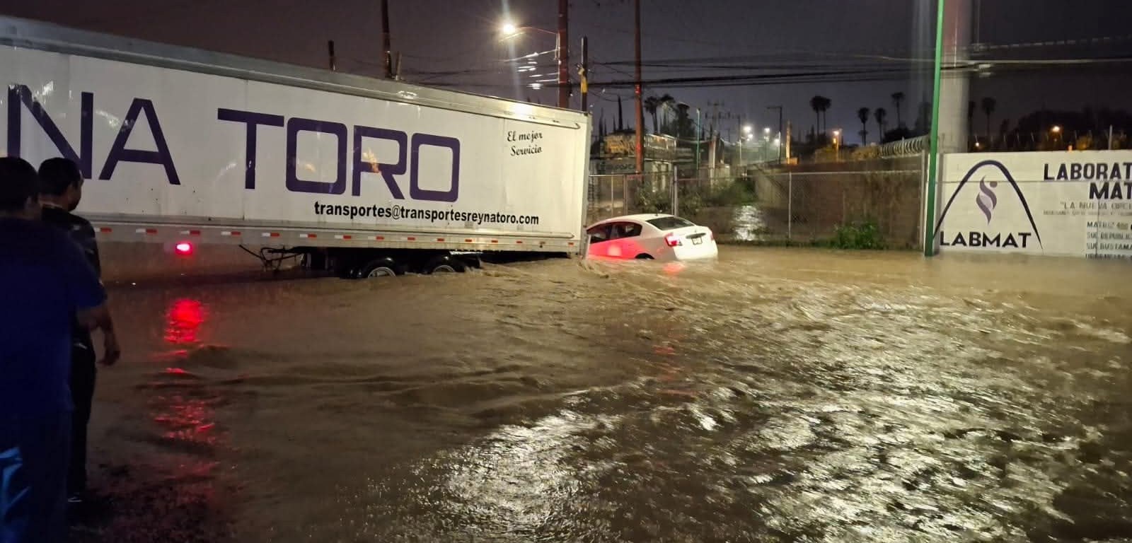 Un vehículo quedó atrapado en la calle de Roble y Boulevard Turístico, en el interior del carro se encontraba una pareja atrapada, la cual fue auxiliada por el operador de un tráiler quien acercó su unidad de carga para que los tripulantes del automóvil subieran a la caja del tractocamión y ponerlos a salvo.