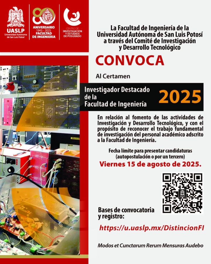 La Facultad de Ingeniería de la Universidad Autónoma de San Luis Potosí (UASLP) lanzó la convocatoria 2025 del certamen “Distinción a la Mejor Tesis” e “Investigador Destacado”, que busca reconocer los trabajos más destacados en los niveles de licenciatura, maestría y doctorado, así como la trayectoria de investigadoras e investigadores de la institución.