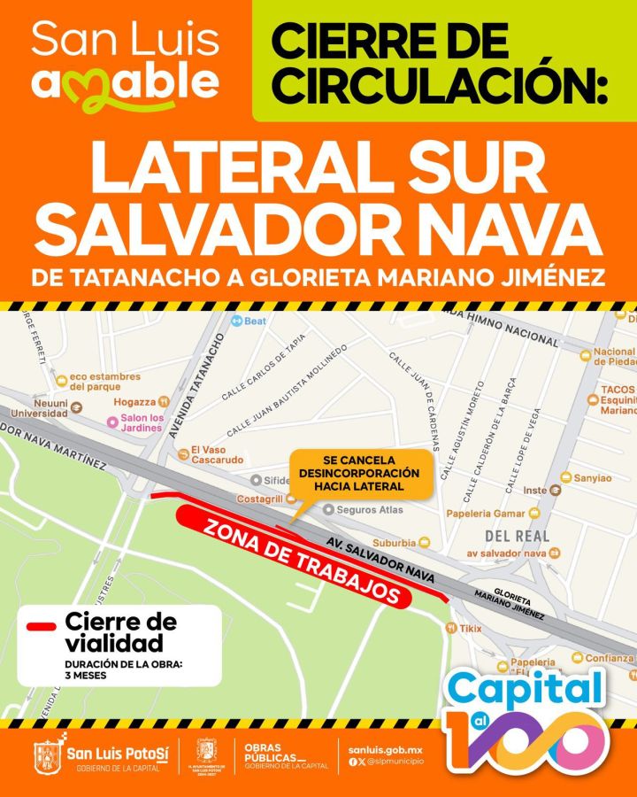 El Gobierno de la Capital, a través de la Dirección de Obras Públicas, informa que se mantiene el cierre temporal a la circulación en la lateral sur de la avenida Salvador Nava, en el tramo comprendido entre la calle Tata Nacho —a la altura de la entrada principal al Parque Tangamanga I— y la Glorieta Mariano Jiménez, así como la gasa de salida que desincorpora carriles centrales de dicha vialidad.