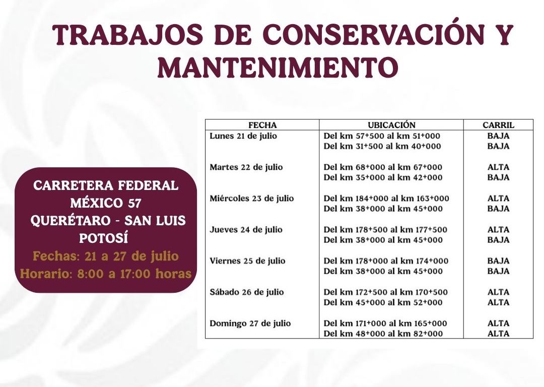 La Secretaría de Infraestructura, Comunicaciones y Transportes en San Luis Potosí, informa que continuarán los trabajos de conservación en la carretera federal 57, en el tramo Querétaro – San Luis Potosí, bajo el esquema Asociación Público Privada (APP).