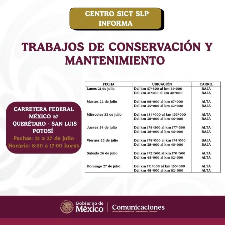 El Centro SICT SLP da aviso oportuno a los conductores y exhorta a los usuarios de esta vía federal para que programen su salida con anticipación.