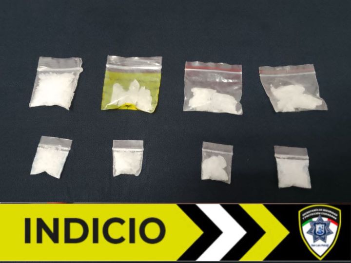 El implicado, identificado como Brian Alejandro “N” de 18 años, fue encontrado en posesión de ocho bolsas de plástico transparente que contenían un polvo blanco granulado con características del cristal.