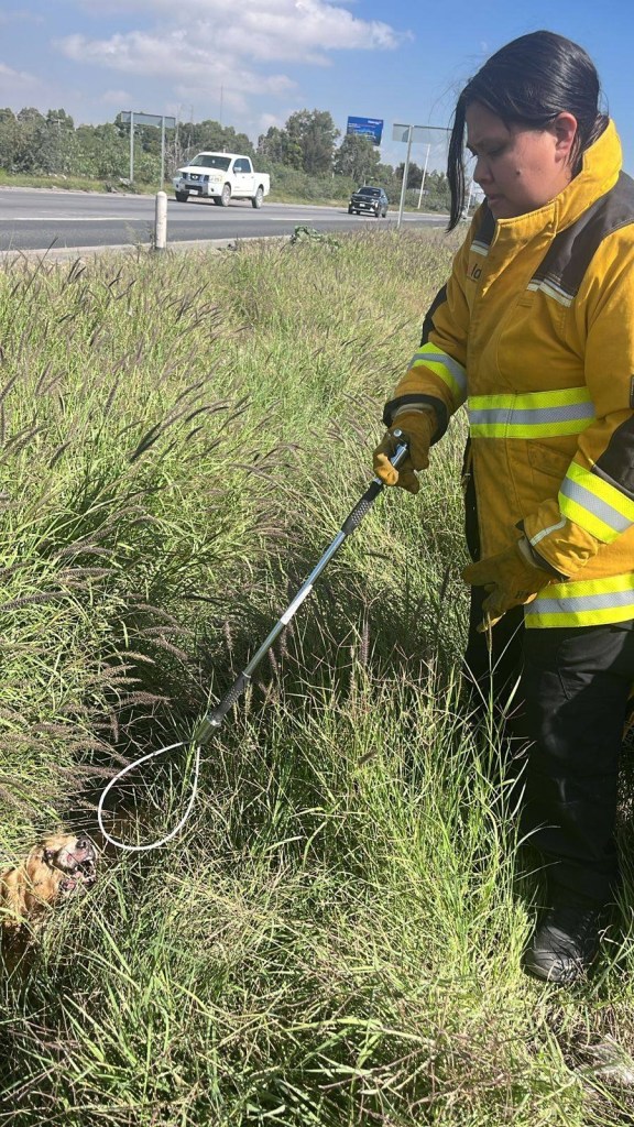 Elementos de la Dirección de Protección Civil Municipal de Villa de Pozos acudieron al llamado de auxilio para rescatar a un perrito que se encontraba herido y desorientado sobre los carriles centrales de la Carretera 57, a la altura del acceso a Los Lagos.