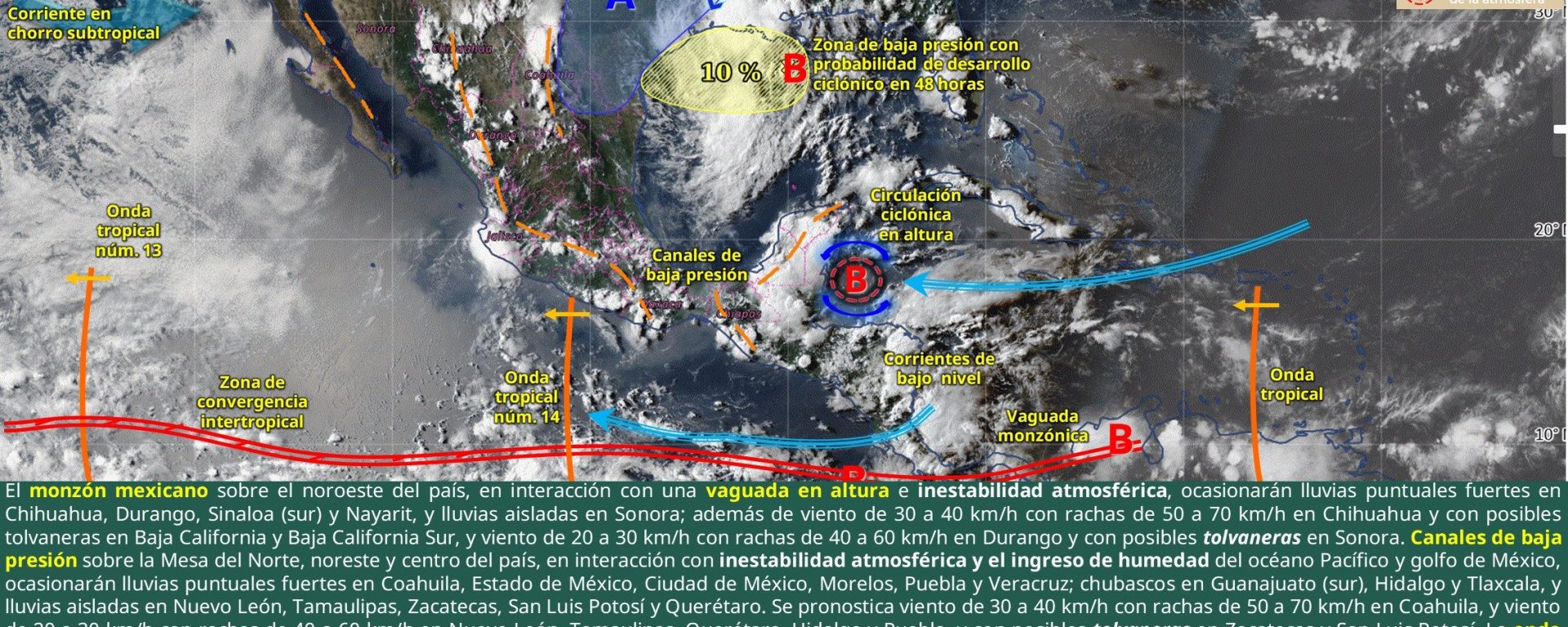 Cielo medio nublado a nublado durante el día, con lluvias puntuales fuertes en Chihuahua y Durango; las lluvias antes mencionadas estarán acompañadas con descargas eléctricas, fuertes rachas de viento y posible caída de granizo; asimismo podrían originar encharcamientos, deslaves e inundaciones, y el incremento en los niveles de ríos y arroyos. Chubascos con descargas eléctricas en Coahuila, Nuevo León, Tamaulipas y San Luis Potosí, lluvias aisladas en Zacatecas y sin lluvia en Aguascalientes. Por la mañana, ambiente templado a cálido y durante la tarde, ambiente cálido a caluroso, siendo muy caluroso en Chihuahua (suroeste y noreste), Coahuila (norte) y Nuevo León (este). Viento de dirección variable de 20 a 30 km/h con rachas de 40 a 60 km/h en Chihuahua, Coahuila y Nuevo León, con posibles tolvaneras en Zacatecas y San Luis Potosí, y viento de 10 a 20 km/h con rachas de 30 a 40 km/h en zonas de tormenta.