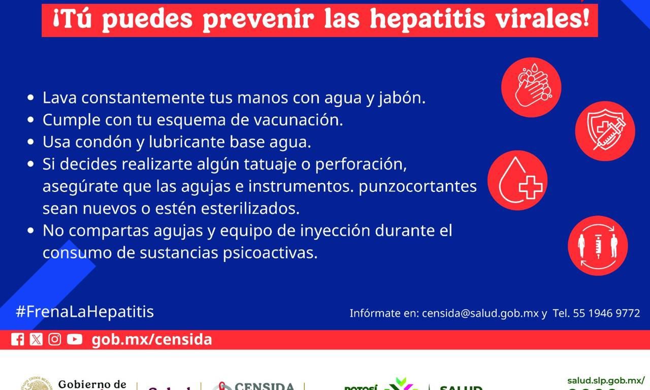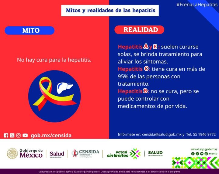 El Gobierno Estatal, en coordinación con el Centro Nacional para la Prevención y Control del VIH y el SIDA(CENSIDA) nos invita a conmemorar el Día Mundial de la hepatitis con el lema “Hepatitis: conozcámosla para combatirla”. La Hepatitis C es curable, con tratamiento gratuito para la población no derechohabiente, con una efectividad de más del 95%, los Servicios de Salud del Gobierno del Estado invitan a la ciudadanía a acudir a las unidades de Salud IMSS Bienestar, donde pueden tratarla.