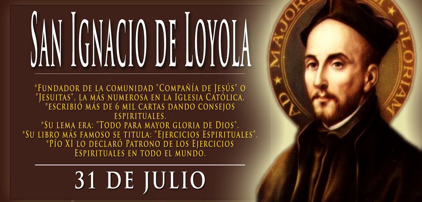 San Ignacio nació en 1491 en el castillo de Loyola, en Guipúzcoa, norte de España, cerca de los montes Pirineos que están en el límite con Francia. Su padre Bertrán De Loyola y su madre Marina Sáenz, de familias muy distinguidas, tuvieron once hijos: ocho varones y tres mujeres. El más joven de todos fue Ignacio. El nombre que le pusieron en el bautismo fue Iñigo. Fundó la Compañía de Jesús. Envió a sus compañeros como misioneros por Europa para crear escuelas, universidades y seminarios donde estudiarían los futuros miembros de la orden, así como los dirigentes europeos.En 1548, sus Ejercicios espirituales fueron finalmente impresos.Los jesuitas jugaron un papel clave en el éxito de la Contrarreforma.
