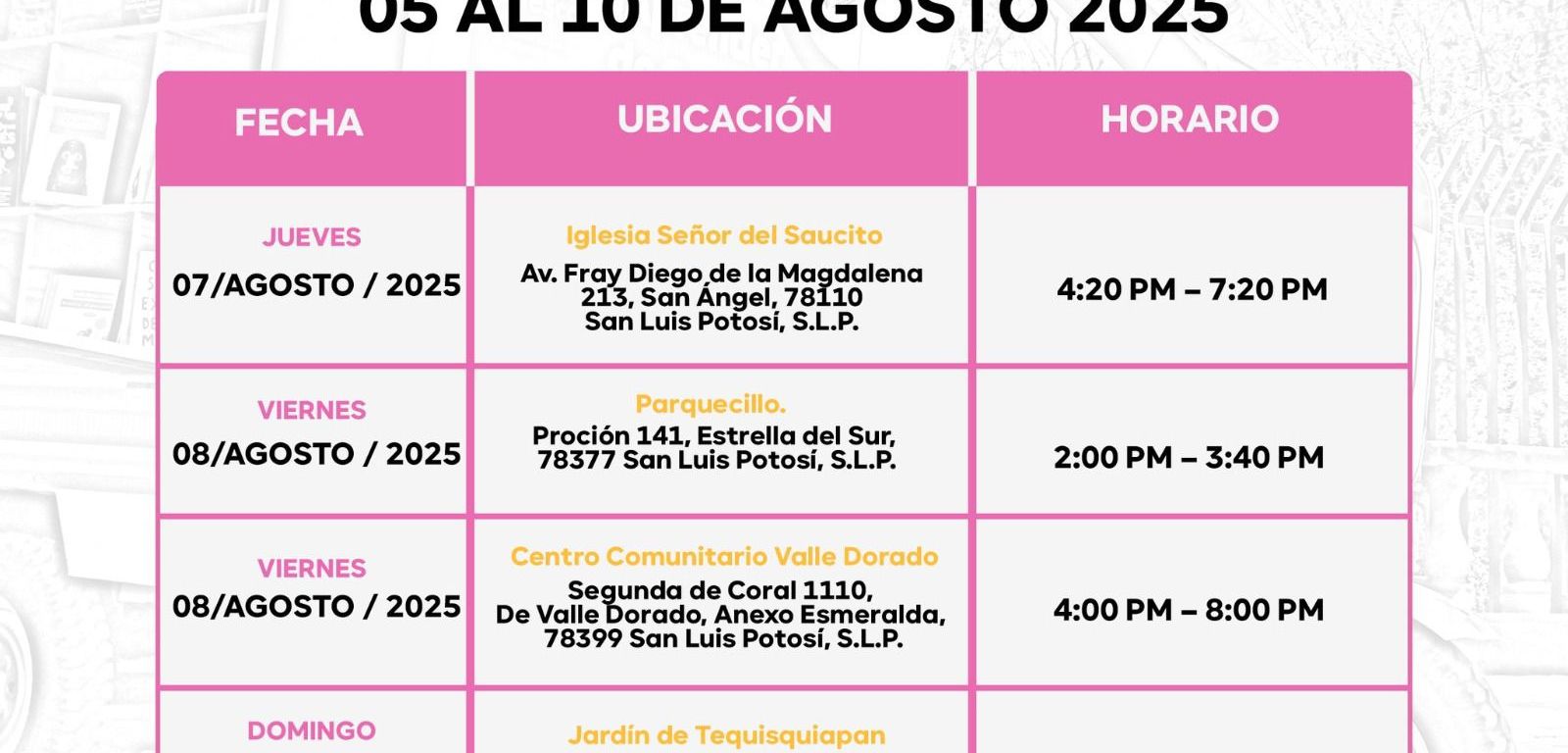 Informó que el jueves 7 el punto 1 será en la calle Cazadores número 180; y el Punto 2 será en la explanada de la Iglesia Señor del Saucito.