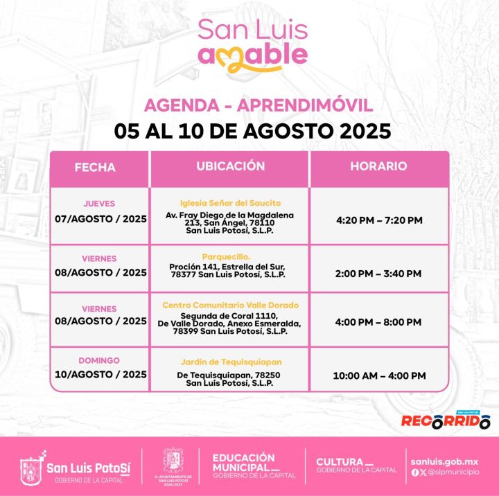 Con el fin de seguir fomentando el hábito de la lectura entre la niñez potosina, la Dirección de Educación del Gobierno Municipal presentó el calendario y lugares de la Capital que serán visitados por el Aprendimóvil durante la primera semana de agosto.