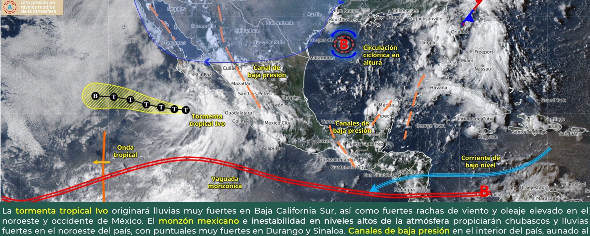 Oleaje de 1.5 a 2.5 metros de altura: costas de Baja California Sur (sur), Jalisco, Colima, Michoacán, Guerrero, Oaxaca y Chiapas.