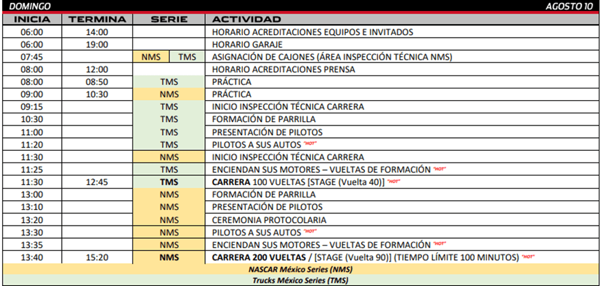 Las acciones la abrirá la categoría de invitación Trucks México Series, para continuar con el plato fuerte la NASCAR México Series y Challenge Series.