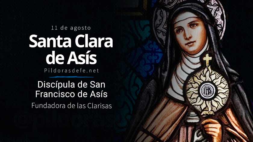 Santa Clara de Asís (en italiano: Chiara d’Assisi; Asís, Italia, 16 de julio de 1194 – ídem, 11 de agosto de 1253), religiosa y santa italiana. Seguidora fiel de san Francisco de Asís, con el que fundó la segunda orden franciscana o de hermanas clarisas, Clara se preciaba de llamarse “humilde planta del bienaventurado Padre Francisco”. Después de abandonar su antigua vida de noble, se estableció en el monasterio de San Damiano hasta morir.