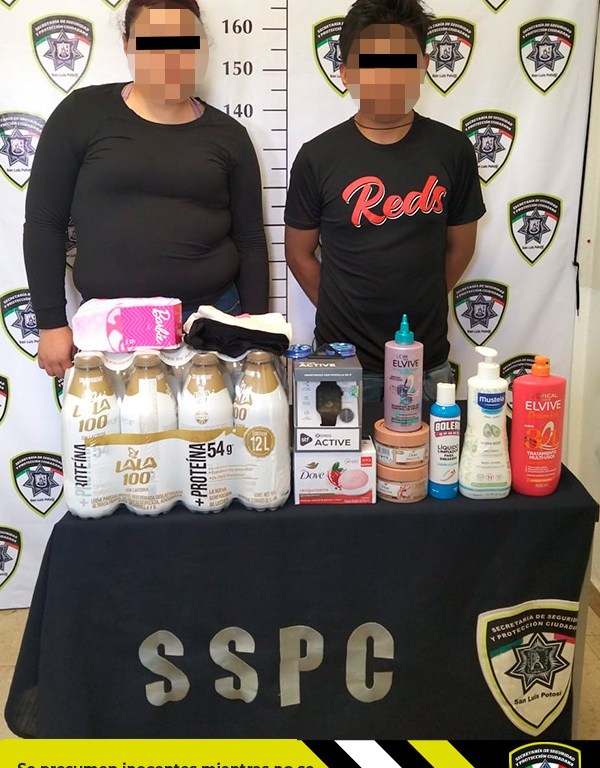 Los implicados, de nombre Roxana Michelle “N” de 23 años y Kevin Aldair “N” de 21 años, fueron detenidos en las inmediaciones, decomisándoles diversos productos con un valor total de 2 mil 224 pesos.