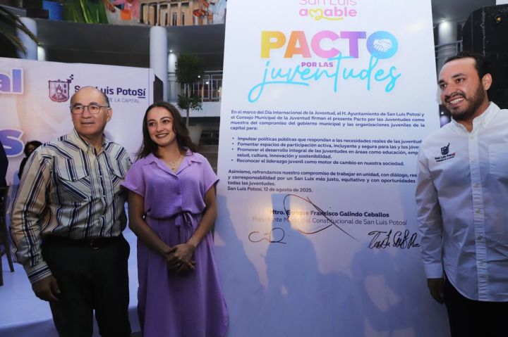 En el marco del Día Internacional de las Juventudes, el Presidente Municipal de San Luis Potosí, Enrique Galindo Ceballos, firmó el Pacto por las Juventudes, acompañado por representantes juveniles de cámaras empresariales, colectivos y asociaciones, refrendando así su compromiso de impulsar políticas públicas que respondan a las necesidades reales de este sector, generar espacios de participación activa, incluyente y segura, así como promover su desarrollo integral y reconocer su liderazgo.