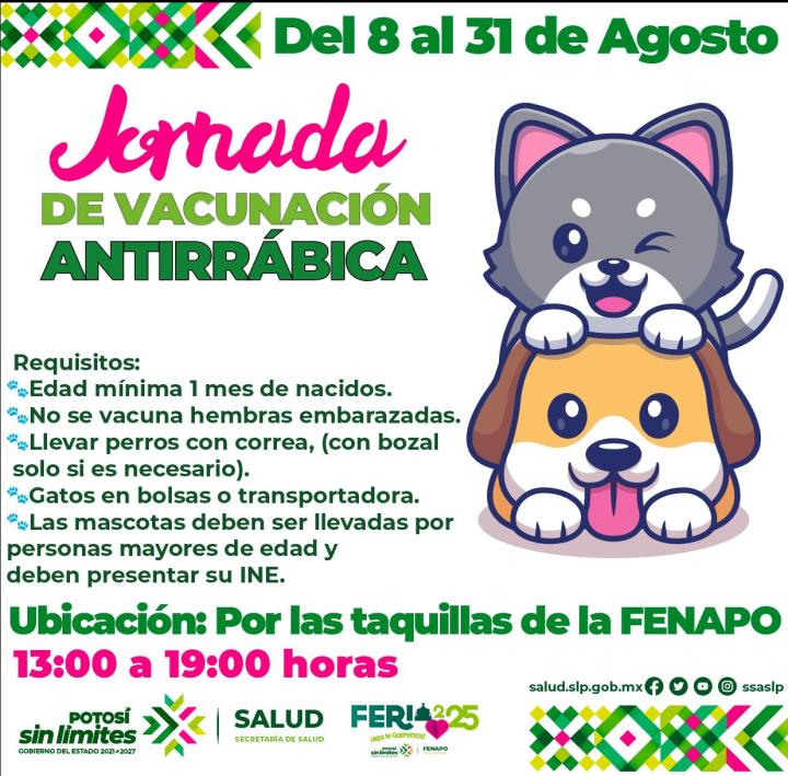 El médico veterinario invitó a la población a que acudan a vacunar a sus mascotas afuera de las instalaciones de la FENAPO, en el puesto de vacunación antirrábica personal de la Jurisdicción Sanitaria No. I estará aplicando el biológico de las 13:00 a 19:00 horas, se piden los siguientes requisitos: las mascotas tienen que tener una edad mínima de 1 mes, no se vacuna a hembras embarazadas, llevar perros con correa (bozal si es necesario), y gatos en bolsas de malla o transportadora. Las mascotas deben ser llevadas por personas mayores de edad (presentar INE).