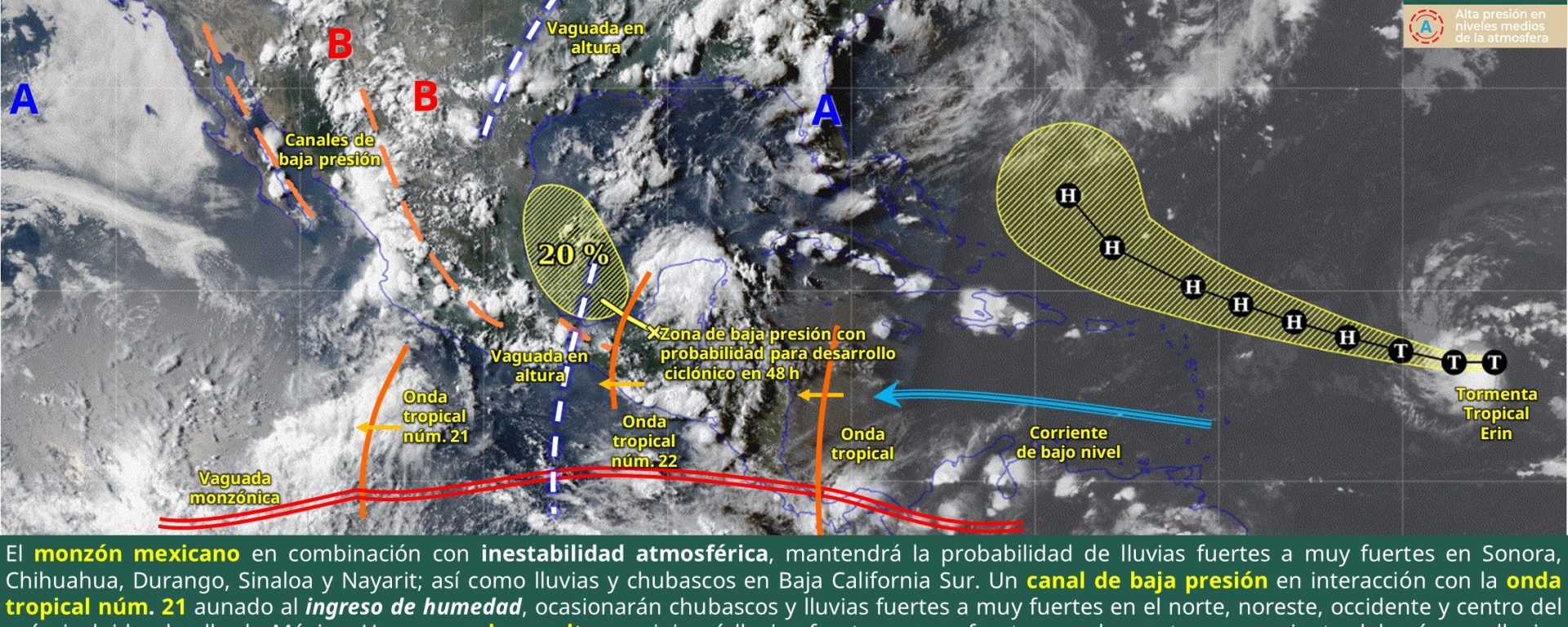 Lluvias fuertes a puntuales muy fuertes (50 a 75 mm): Sonora, Chihuahua, Durango, Sinaloa, Nayarit, Jalisco, Colima, Michoacán, Guerrero, Oaxaca, Estado de México, Ciudad de México, Morelos, Tlaxcala, Puebla, Veracruz, Chiapas y Tabasco.