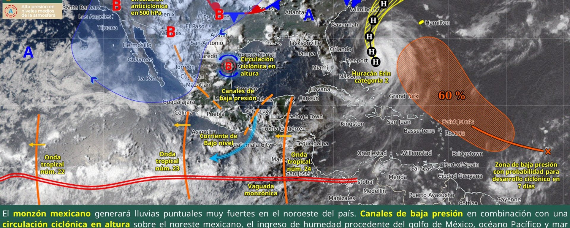 Chubascos con lluvias puntuales fuertes (25 a 50 mm): Sonora, Sinaloa, Chihuahua, Durango, Coahuila, Nuevo León, San Luis Potosí, Estado de México, Morelos, Puebla, Veracruz, Tabasco y Campeche.