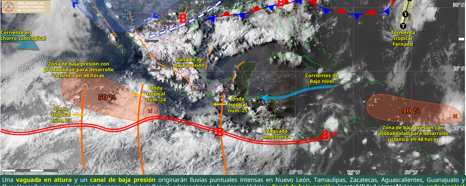 Chubascos con lluvias puntuales fuertes (25 a 50 mm): Chihuahua, Coahuila, Nuevo León, Ciudad de México, Tlaxcala, Morelos y Tabasco.