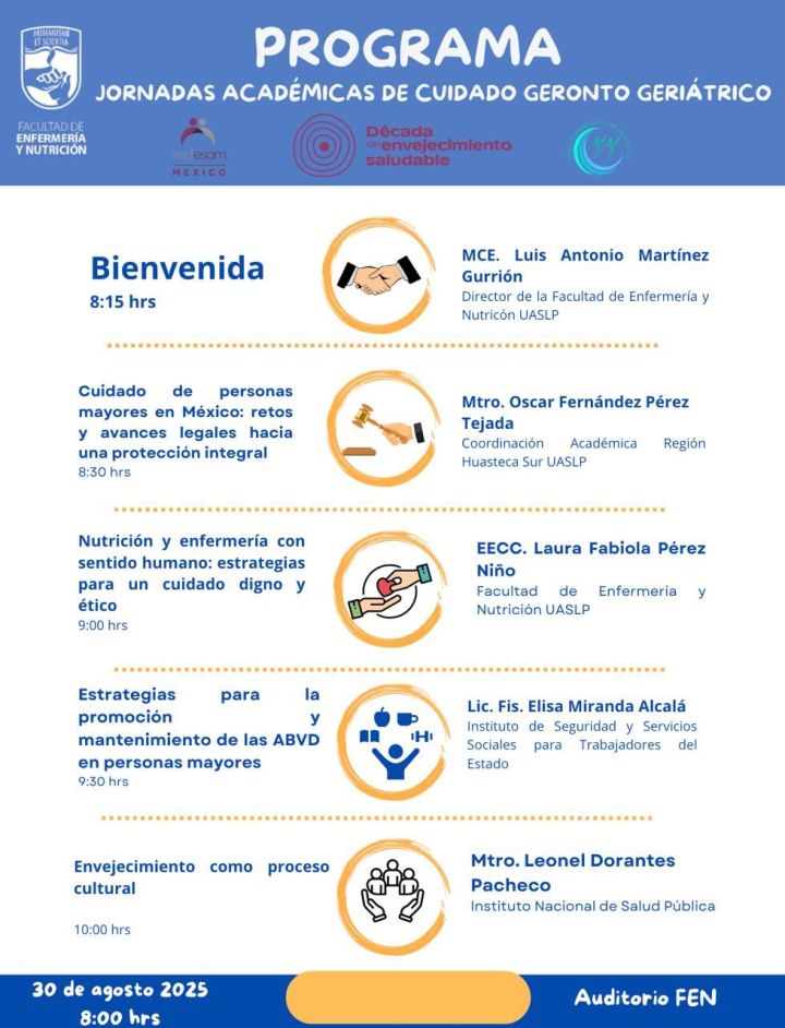 Por tercer año consecutivo, la Facultad de Enfermería y Nutrición de la Universidad Autónoma de San Luis Potosí (UASLP), a través de las carreras de Licenciatura en Nutrición, Licenciatura en Enfermería y la Especialidad en Cuidado Gerontogeriátrico, llevará a cabo las Jornadas Académicas de Cuidado Gerontogeriátrico este sábado 30 de agosto de 2025, a partir de las 8:15 horas, en el auditorio de la entidad.