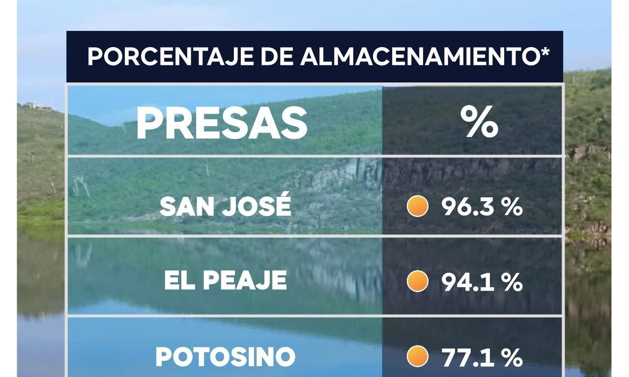 Según el más reciente reporte del INTERAPAS, la presa de San José está en un 96.3 %; El Peaje en un 94.1; El Potosino en un 77.1 y la Cañada del Lobo en un 51.9 por ciento, luego de las lluvias registradas durante estos días.