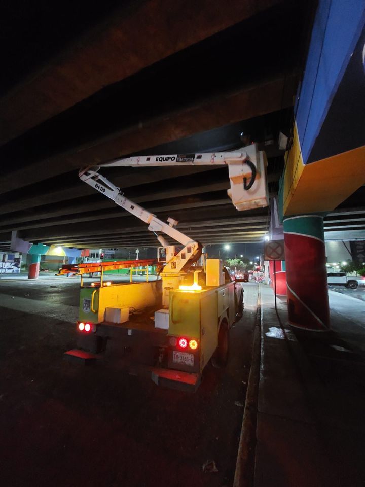 Además, en un recorrido de supervisión sobre la avenida Salvador Nava Martínez, desde el Distribuidor Juárez hasta el puente de Pemex, se encontraron varias luminarias apagadas. Tras revisar los registros, se detectaron líneas quemadas y líneas aterrizadas en distintos puntos. Se realizaron sustituciones, reparaciones y reconexiones, logrando restablecer el servicio y encender aproximadamente 38 luminarias LED.