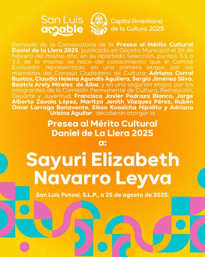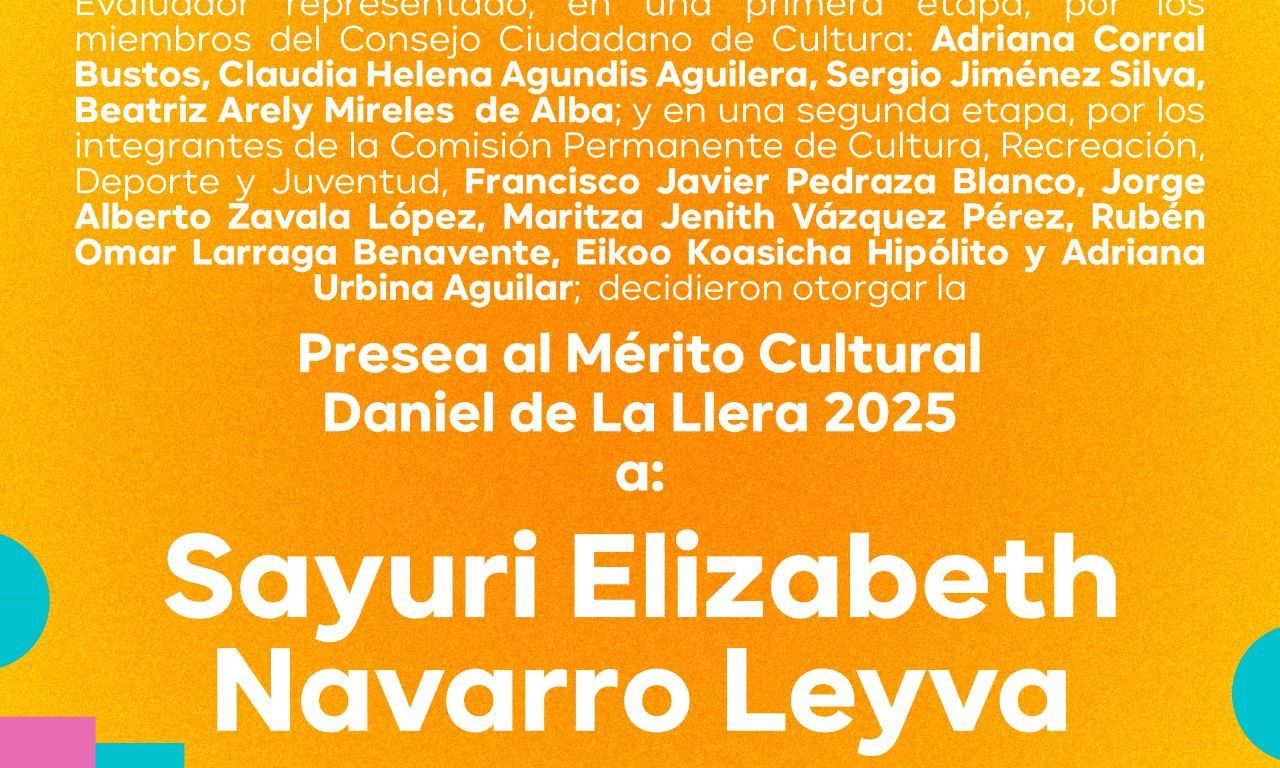 Los integrantes de la Comisión de Cultura y Deporte del Ayuntamiento de San Luis Potosí eligieron a la dramaturga potosina Sayuri Elizabeth Navarro Leyva como la acreedora de la Presea al Mérito Cultural “Daniel García Álvarez de la Llera”.
