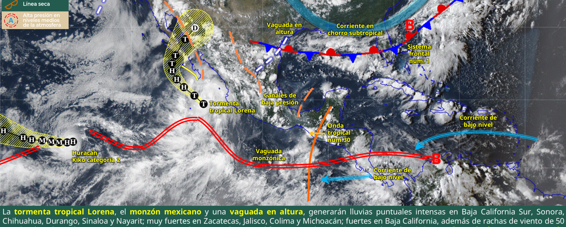 Lluvias muy fuertes con puntuales intensas (75 a 150 mm): Baja California Sur (centro y sur), Sonora (centro y sureste), Chihuahua (oeste y suroeste), Durango (noroeste, oeste y suroeste) y Sinaloa.