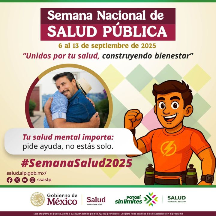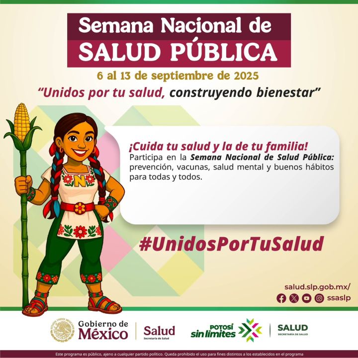 La Semana Nacional de Salud Pública (SNSP) 2025 en México se celebrará del 6 al 13 de septiembre, bajo el lema: “Unidos por tu salud, construyendo bienestar”, busca dar atención a 20 millones de personas en todo el país. San Luis Potosí, se suma a estas acciones, por lo que el próximo sábado 6 de septiembre se celebrará el arranque de la Semana Nacional de Salud Pública en el municipio de Matlapa, a partir de las 10:00 de la mañana en la Galera Chalchocoyo. Posteriormente y de manera aleatoria se desplegaran acciones en los 59 municipios a través de las siete Jurisdicciones Sanitarias.