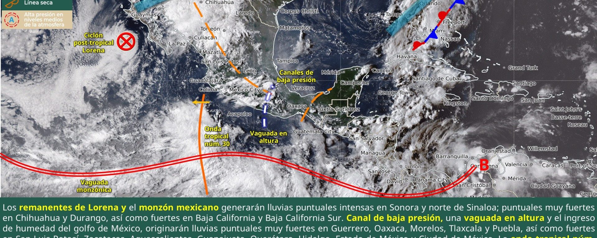 Chubascos con lluvias puntuales fuertes (25 a 50 mm): Sonora, Chihuahua, Sinaloa Coahuila, San Luis Potosí, Nayarit, Jalisco, Colima, Michoacán, Estado de México, Ciudad de México, Guerrero, Oaxaca, Chiapas, Puebla, Veracruz, Yucatán y Quintana Roo.