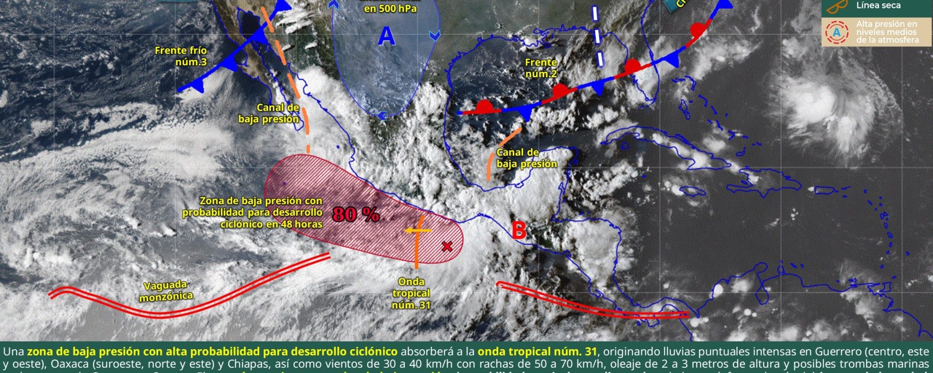 Viento de 10 a 20 km/h con rachas de 30 a 50 km/h: Baja California Sur, Nuevo León, San Luis Potosí, Guanajuato, Querétaro, Hidalgo, Puebla, Tlaxcala, Estado de México, Ciudad de México, Colima (costa), Oaxaca, Chiapas, Campeche y Yucatán.