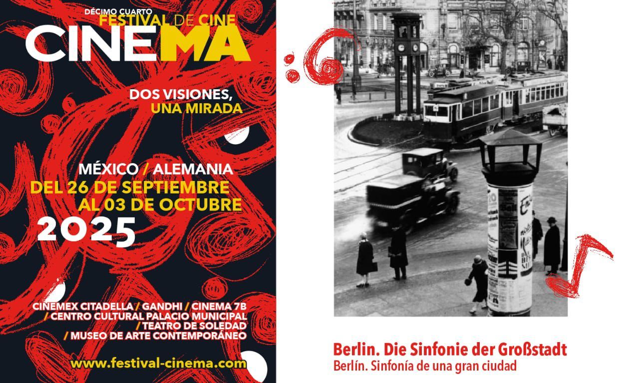 Para esta ocasión, se presentará la emblemática cinta “Berlín, sinfonía de una gran ciudad” (Berlin. Die Sinfonie der Großstadt), dirigida por Walter Ruttmann (Alemania, 1927). Una obra maestra del cine silente que retrata, con gran potencia visual, el pulso cotidiano de la metrópoli alemana en la década de los veinte. La función será musicalizada en vivo, recuperando la experiencia de la exhibición original y ofreciendo al público un acontecimiento artístico único.