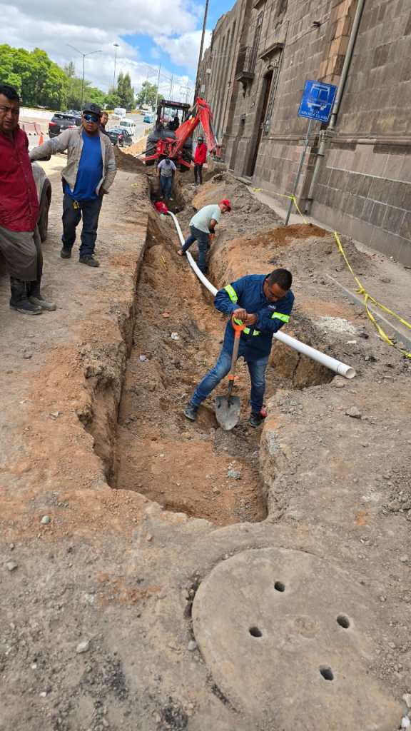• Los trabajos aavanzan en la colocación 24 metros de tubería de agua potable y 18 de drenaje, frente al templo de San José en La Alameda.