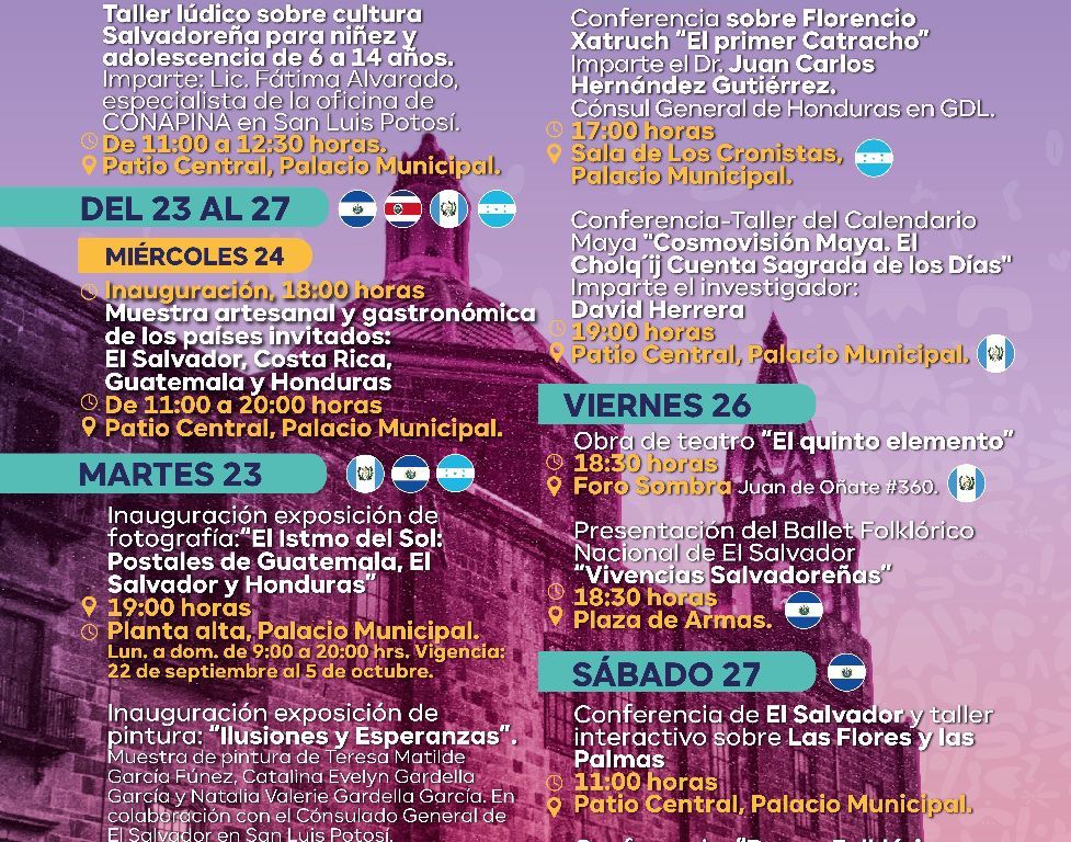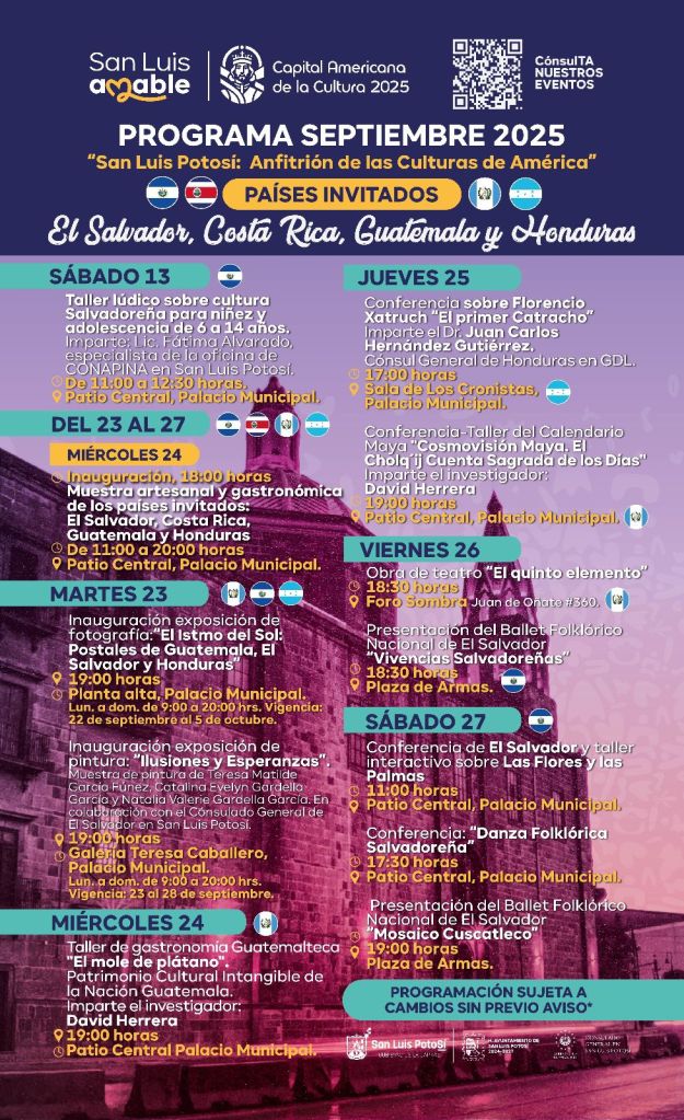 El Gobierno de la Capital presenta San Luis Potosí Capital Americana de la Cultura 2025, en la que del 23 al 27 de septiembre se presentarán países de Centroamérica que traerán sus tradiciones, cultura, gastronomía y folklore, siendo sede el Centro Cultural Palacio Municipal y la Plaza de Armas.
